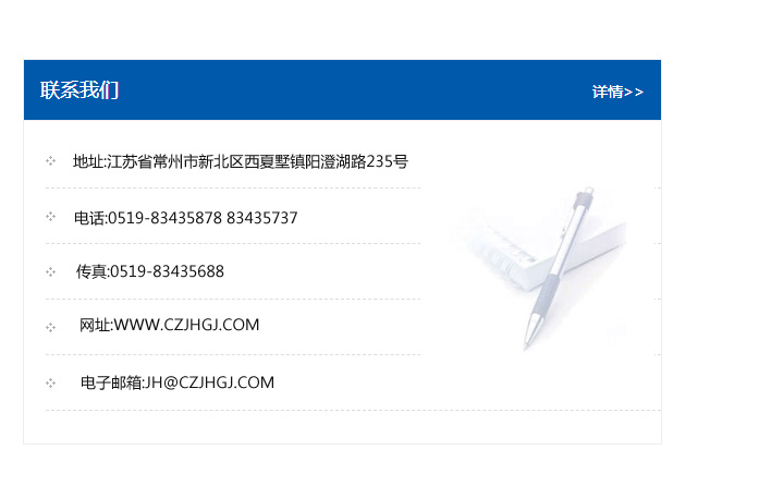 地址:常州市新北區友邦商務大廈1幢16、17層  電話:0519-85101652  傳真:0519-85112595  郵編:213022  網址:www_cz-jiayue_cn.sdlyxx.com  郵箱:xiajifengaa@163.com